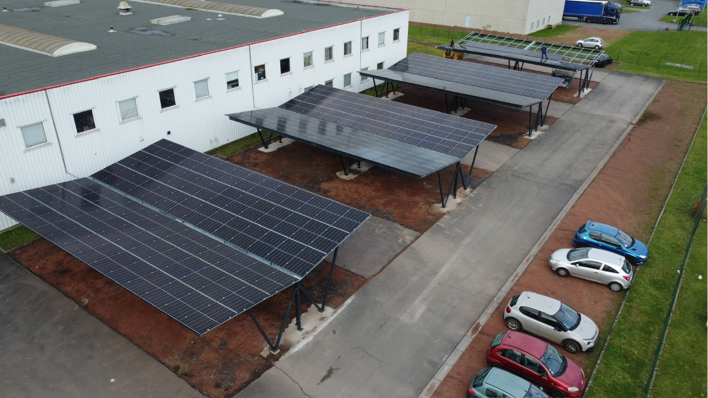 Installation d’ombrières photovoltaïques sur parking d’un site industriel – puissance installée : 180 kWc.