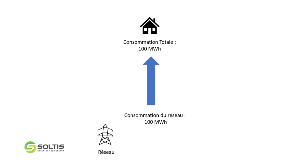 Pour illustrer notre explication, prenons l'exemple concret d'une entreprise française consommant 100 MWh/an (100 000 kWh/an) et disposant d'une installation photovoltaïque produisant 30 MWh/an. Cela équivaut à environ 75 panneaux solaires de 430 Watts-crête (Wc, puissance en conditions standard), soit une puissance installée de 32 250 Wc (Wc : puissance en conditions standard)